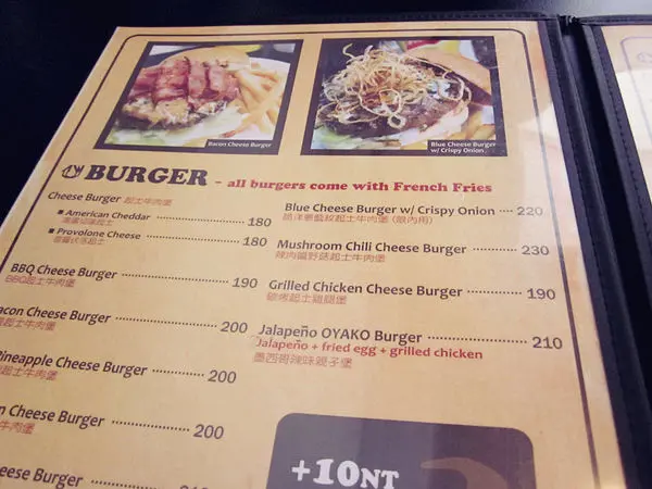 菜單簡單幾頁,通通都是漢堡,看起來清楚明瞭,所以很快就點好了。漢堡有牛肉和雞肉口味,再加上起士、培根或花生醬做變化,單點價位從180元到230元,另外也有單點飲品和副食的選擇。