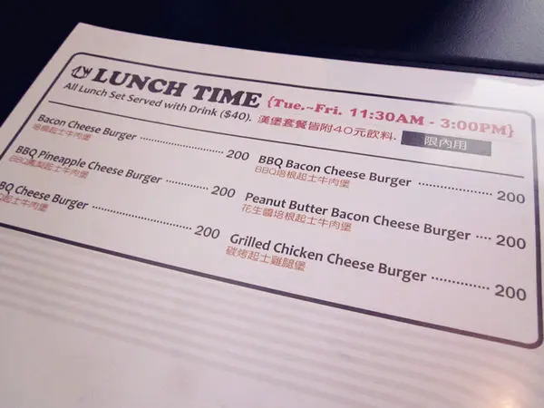 星期二到星期五 11點半到3點,有200元的超值套餐組合!六種漢堡皆是200元,再附飲品和薯條喔。