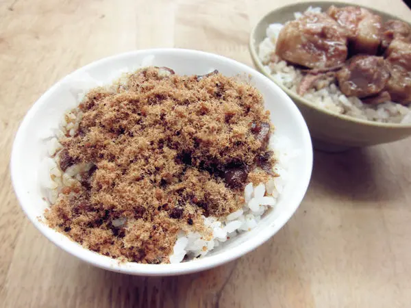 旗魚鬆飯,飯上面淋上肉燥醬汁再鋪上一層滿滿的旗魚鬆,將細密的魚鬆和滷肉醬汁拌在一起吃,除了吃到滷汁的鹹香,還有炒魚鬆的溫和口味,讓人不禁一口接一口呀。