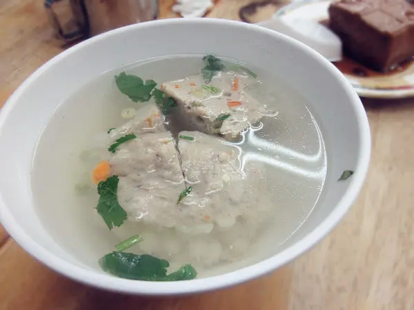 苦瓜丸湯,苦瓜燉得不太苦,變成香甜去火,口感溫潤,包覆在裡頭的肉丸Q彈有嚼勁呀。吃完飯來碗熱湯,好飽好滿足呀。
