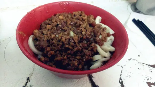 炸醬麵不太像傳統炸醬麵有加入豆干和豆瓣醬,反倒像是肉醬麵,用一般豬絞肉炒過再燉煮的肉醬,再弄個一瓢滿滿的蓋在麵上,榨醬給的很大方,讓每一根麵條都均勻攪拌到。雖然看起來沒有很驚艷的外表,而且感覺充滿油膩感。但是吃了一口以後,卻對這碗麵完全改觀了呀,偏瘦的魯肉炸醬,吃起來偏甘甜的口感,讓人一口接一口,而且麵條的咬勁真是屬上乘之作,真的好Q彈喔。