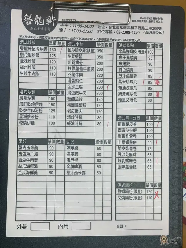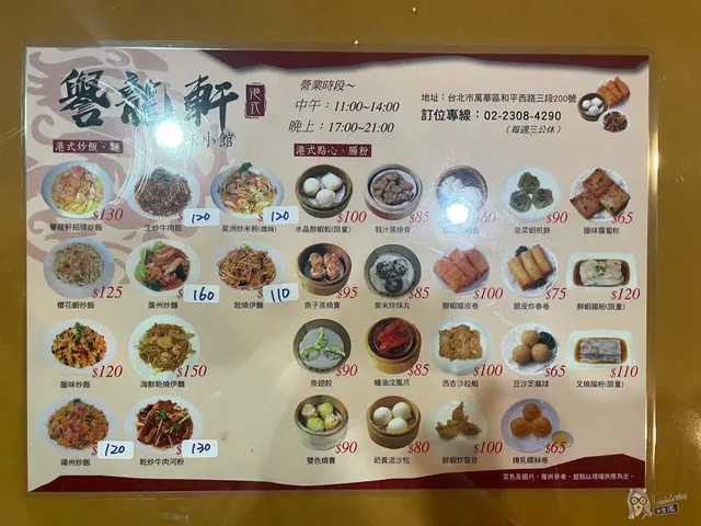 無意間發現萬華一家平價的港式飲茶,譽龍軒港式美味小炒位在和平西路三段,從龍山寺捷運步行只要四五分鐘,旁邊還有超人氣的原汁排骨湯和平本舖、龍都冰果専業家等,譽龍軒有港式炒飯、廣州炒麵、港點等,餐點價位平易近人,口味尚可,是能夠偶爾打打牙祭的餐館。