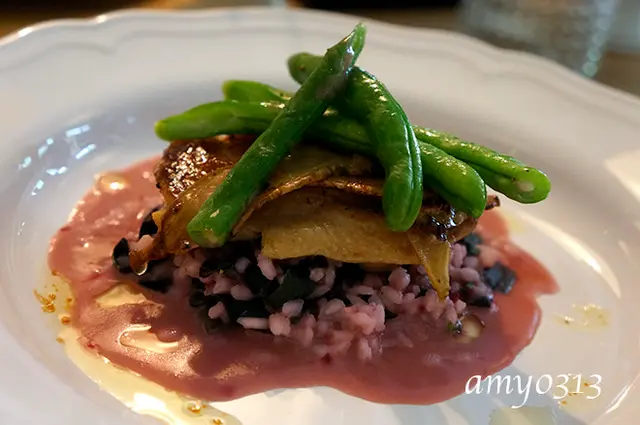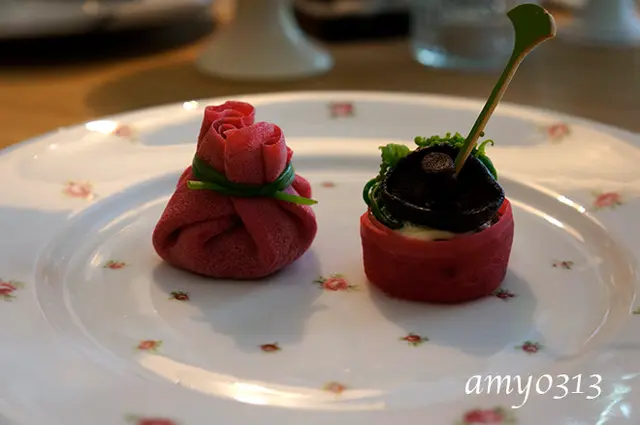 甜菜根鮮蝦奶油福袋與香料豬肉丸開餐的一口食就讓大家不住驚呼,福袋皮軟中帶點微Q,口感極佳,一咬下去裡頭的奶油香與蝦子的鮮味瞬間在嘴裡散開,非常迷人;當然豬肉丸也沒讓人失望,上頭放有滷過的香菇,鹹香可口,配上帶著特殊香料的豬肉丸,美味十足。