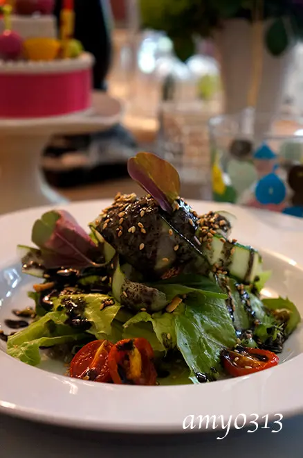 黑芝麻黃瓜卷沙拉黑芝麻醬汁調得真好,芝麻醬本身的香氣非常濃郁,淡淡的醋香搭配更添風味,盤裡的烤蕃茄則起了畫龍點睛的作用,讓整道沙拉的韻味變得豐富又美好。