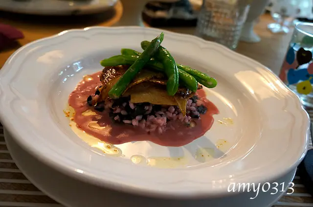 這道料理一上桌大家都驚呼“好漂亮”,從來不知道料理能呈現出這種粉嫩的玫瑰色,大家都很好奇是什麼食材?結果它竟然是amy不吃的“紅鳳菜”。amy只在小時候吃過,印象中的“紅鳳菜”不是很討喜,但這天對“紅鳳菜”完全改觀,沒想到它可以拿來燉飯,而且還是如此美麗又好吃。