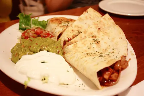 用墨西哥玉米餅包著莎莎醬、起士及炒洋蔥等等
