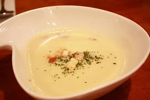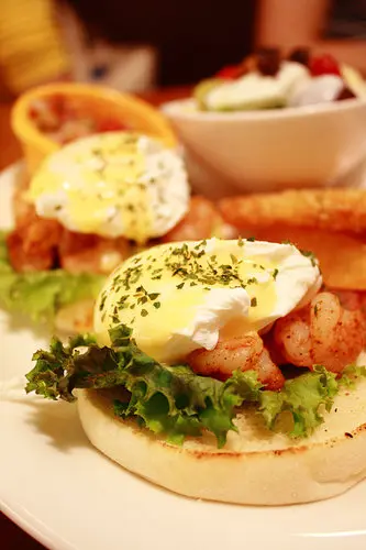搭配麵包和加拿大培根片+辣味鮮蝦再淋上荷蘭起司醬混合而成