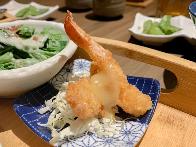 炸蝦,裹上薄薄一層麵衣酥炸,不會令人感到油膩,再搭配一旁的美乃滋更加爽口。