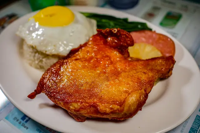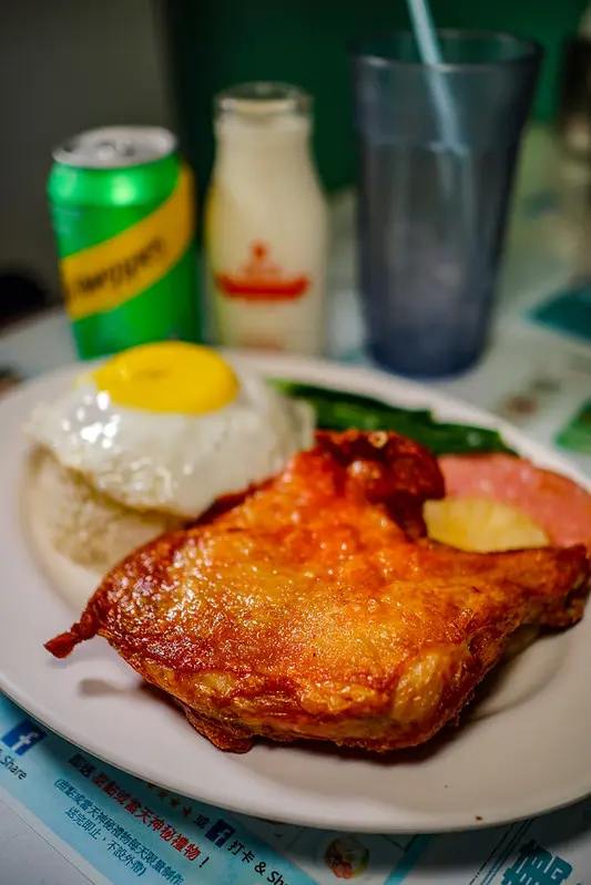 生炸雞髀,就是台灣的生炸雞腿,不過兩邊的雞腿吃起來相當不同,可能與醃料上的差異有關係,這裡的雞腿可以說是台北雞腿飯前幾名的店家了,雞腿皮酥肉嫩,一咬下去要小心噴出來的肉汁會燙到手。所以它必需要一上桌就趕快吃,冷了味道就相當不好