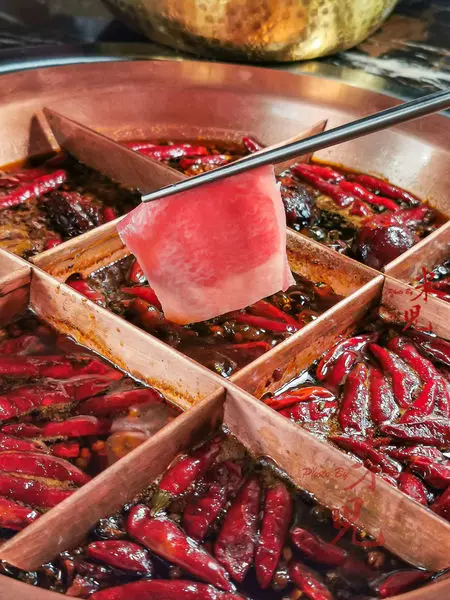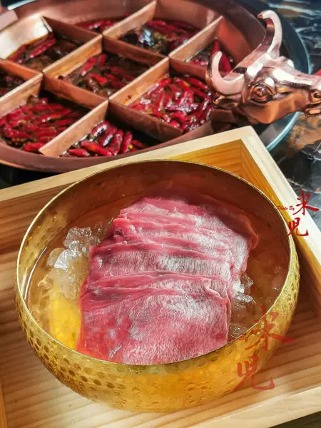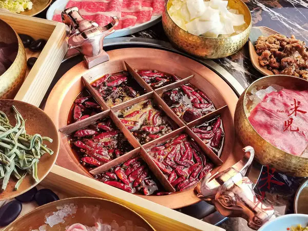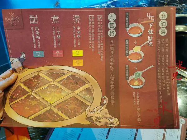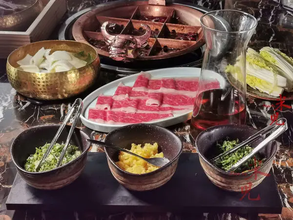 九宮格式吃法,加上訂製的牛頭銅鍋,光是賣相就與眾不同。如果不吃辣的人,亦有鴛鴦鍋的選項,白湯擁有以干貝乾、金華火腿熬煮出的雞濃湯與牛肉清湯兩種選擇。