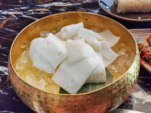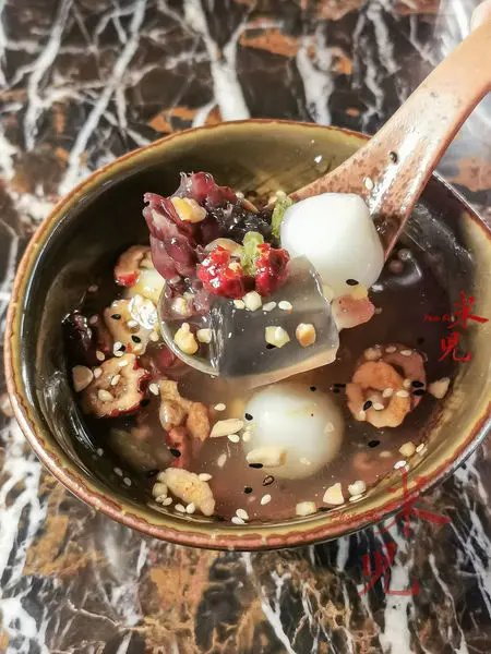 重慶冰粉,100大洋。台灣麻辣鍋店的甜點多半乏善可陳,麻辣45居然點得到我最愛的冰粉!!!這冰粉吃法和我在四川吃的不太一樣,加了許多堅果、紅棗、芝麻、青提子等等,加上紅糖水提味,去辣解膩的效果非常好~~
