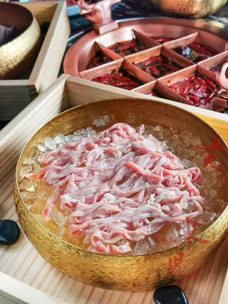 5秒牛舌,280大洋。因為集團和牛進口優勢,這裡的火鍋料也點得到和牛舌,切成薄片的和牛舌輕涮五秒就能享用,口感超棒,是來麻辣45必點的食材。涮煮和牛舌時間不宜過長,否則就老了~~