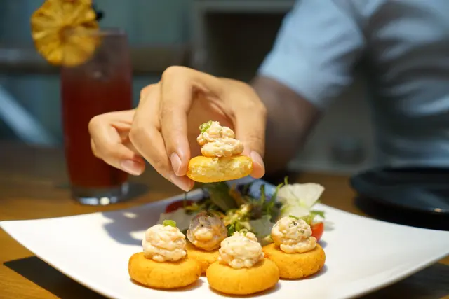 手工的薯泥酥炸成finger food底,搭配上鹹鮮的燻鮭魚沙拉