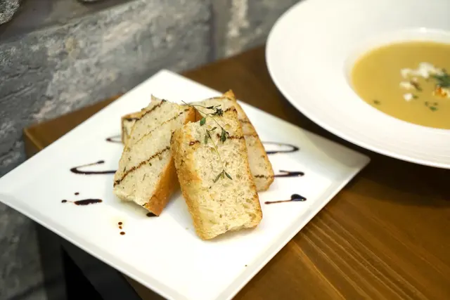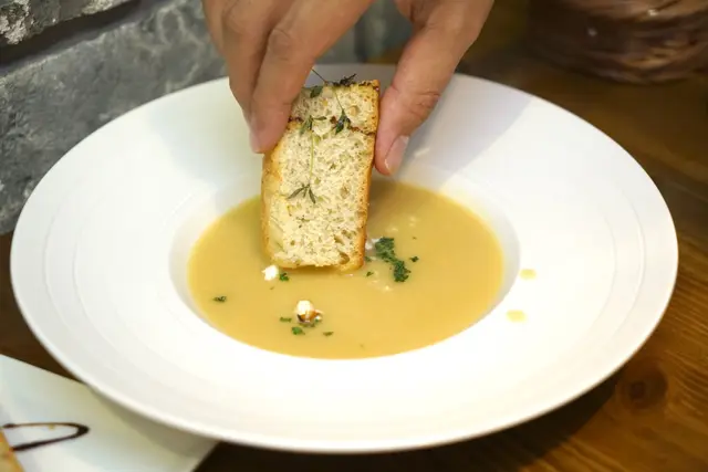 從現烤佛卡夏搭配義式油醋、然後本日濃湯是新鮮玉米打成漿的香甜