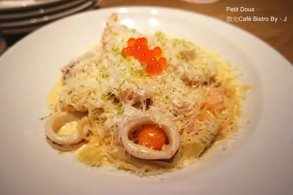 整體搭配上真的很美,海鮮也給的很大方,雖然是用蘇維儂白酒(但是不含酒精),應該就是料理用的白酒所以酒精濃度也不會太高,加上煮食的過程也都蒸發了,不敢喝酒的人可以放心嚐試,裡面還有現剝的帶殼蝦、近海新鮮小卷、日本來的鮭魚卵、法國 Isigny鮮奶油及蒜味白醬、現刨原塊帕瑪森起司。