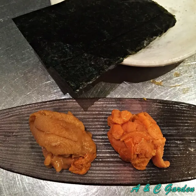 海苔包上鮮甜干貝還夾著海膽以及馬糞海膽,