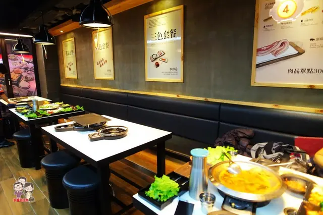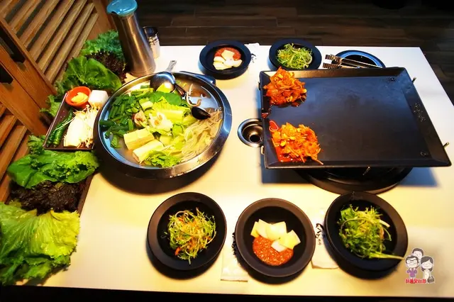除了特製的烤盤外,還有個火鍋以及一長排的生菜。