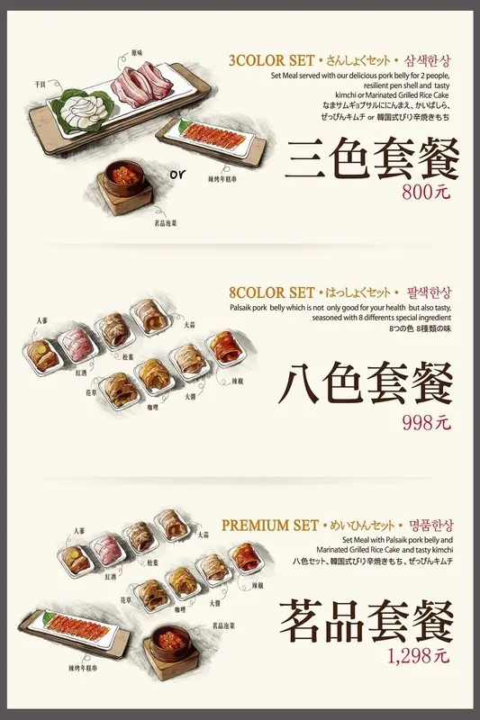 吃不過癮的朋友,則可以加點,各種口味的五花肉,一份都是300元/兩片。