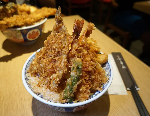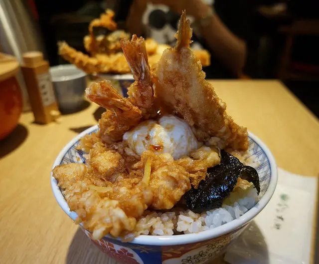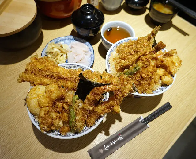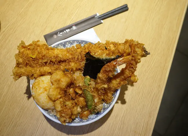 裡面包含了鱚魚、鳳尾蝦、魷魚海鮮炸、青龍、炸半熟玉子、炸海苔片。主要和江戶前天丼差別在於魚!