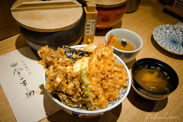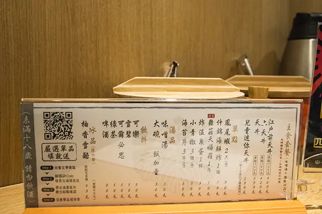 三款基本品項為天丼 NT$350(單點價格)、上天丼 NT$380(單點價格)、江戶前天丼 NT$450(單點價格),其他有兒童迷你天丼與3/14會推出適合女性享用的錦天井。套餐價格是另外加NT$49有味噌湯、雪酪冰品。