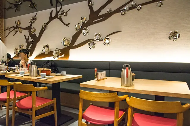 如同一般的日式餐廳,坐下後不太需要再站起來,桌上已經備有裝滿黑豆茶的保溫壺,餐具以及小菜盅等物,店員會先問有沒有來過店裡,接著介紹食用步驟。