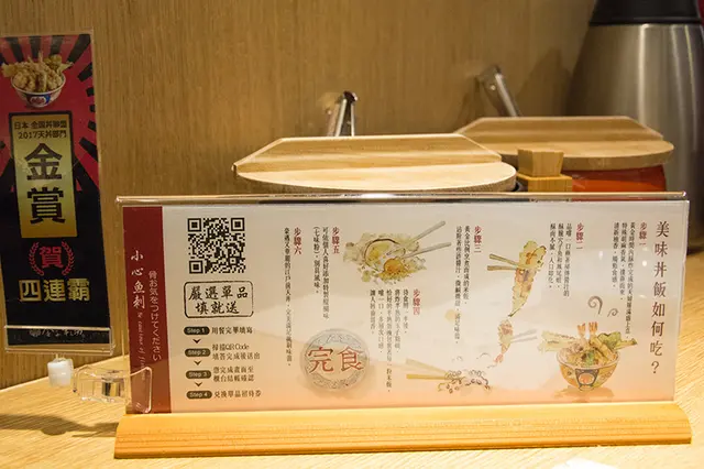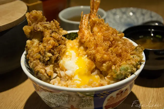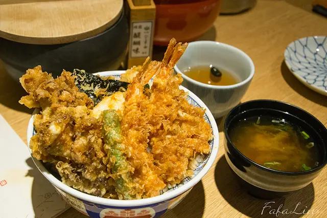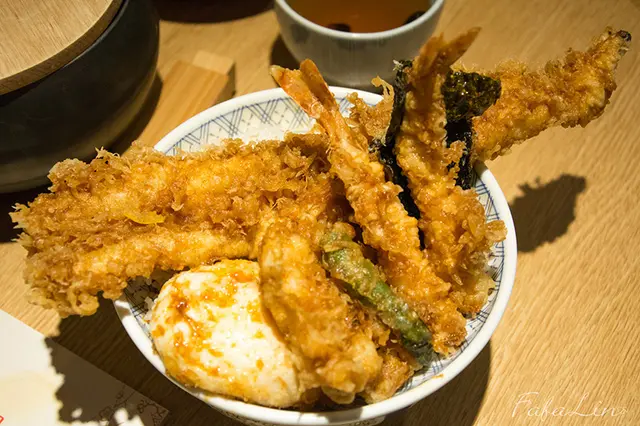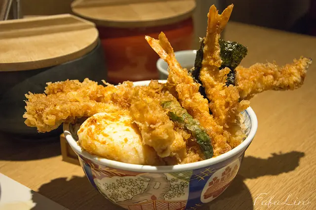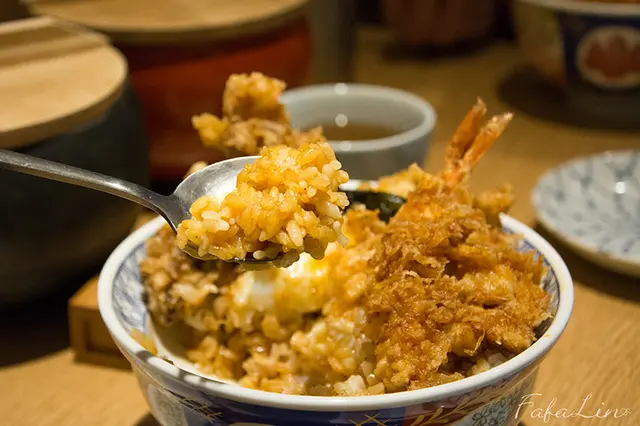 一開始先吃已經淋過醬汁的海鮮類,如鳳尾蝦和穴子魚,接著再吃一口碗內米飯,如果上面炸物覆蓋著,可以先放在旁邊盤子上,等待吃到一半時,將半熟的炸玉子戳破,品嚐每一顆被蛋汁覆蓋的米粒,如果想轉換風味或著覺得味道不夠可以加特製七味粉。