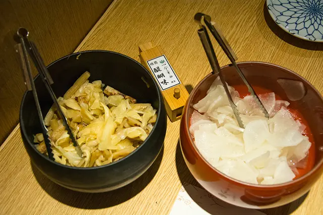 桌上小菜日式蘿蔔、牛蒡薑片皆屬於無限供應,適時的與日式蘿蔔一起入口,帶來的清香風味可以舒緩味蕾。小菜盅中間是醍醐味的七味粉。