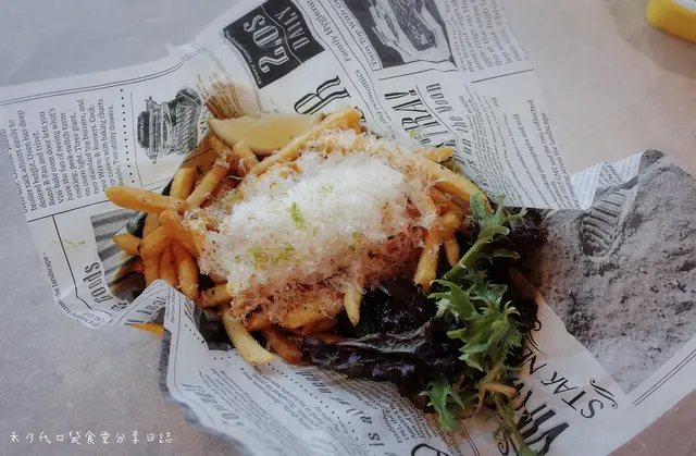 首先上桌的是~擁有濃濃美式風格的現炸脆薯,與以往印象中一般餐廳不一樣,不單單只有薯條與番茄醬~而是在上頭覆蓋了厚厚一層現刨大量provolone cheese及青檸皮屑,再自行擠淋鮮檸檬汁,食用間還可搭配蔬菜,在濃郁起司香氣中竄出一道清爽,色澤金黃口感酥脆且無油耗味。