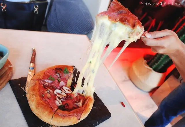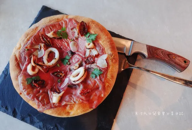 極為扎實的深盤相當霸氣,拿起來的手感超有份量,我好喜歡它的粉嫩色,使用在地食材激盪出獨有的異國風情,表層鋪綴著透抽及時蔬,微酸的滋味平衡著大量乳酪的濃重,附上刀具方便分切,張開嘴巴準備好來盛大迎接美味的起司瀑布啦!!