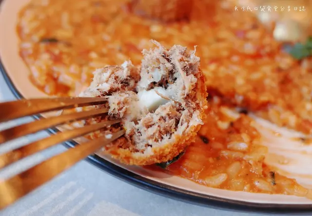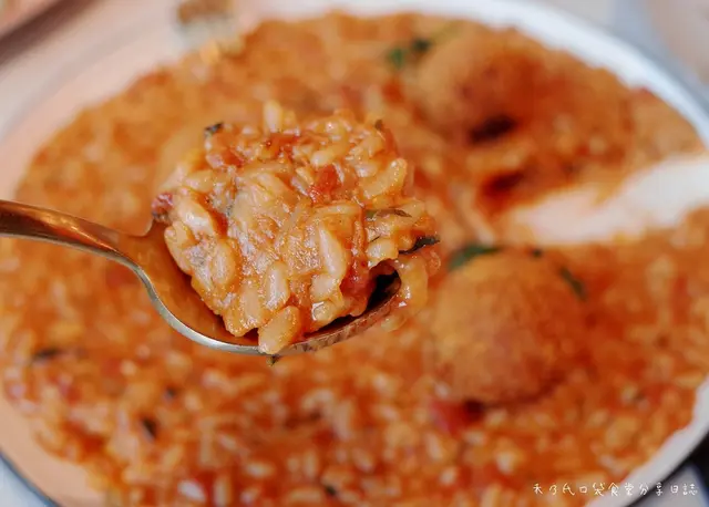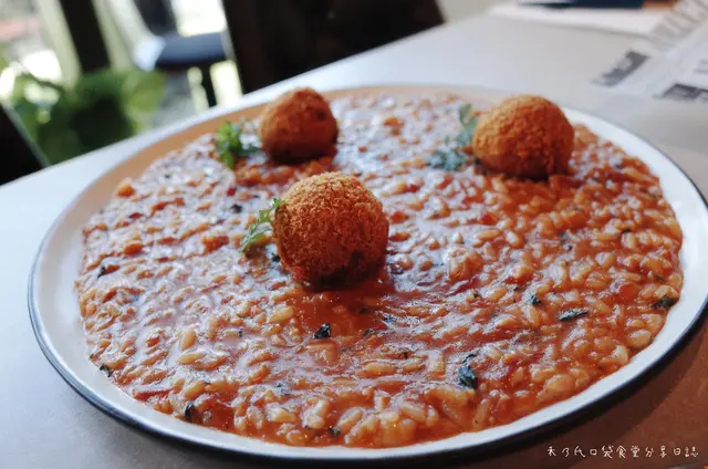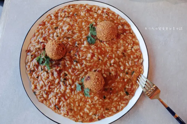 如藝術品般的燉飯上桌,粒粒分明的飯粒有稠度的完美均勻貼合在瓷盤上,以富有嚼勁的丹佛牛肉部位,燉煮兩小時至軟爛入味,加入洋蔥、甜椒、腰果、莫札瑞拉起司、鮮奶油等,裹粉油炸至金黃的手工製成牛肉球,如同打穩地基的建物置放在表面有光澤的燉飯上,圓滾得可愛又可口!!