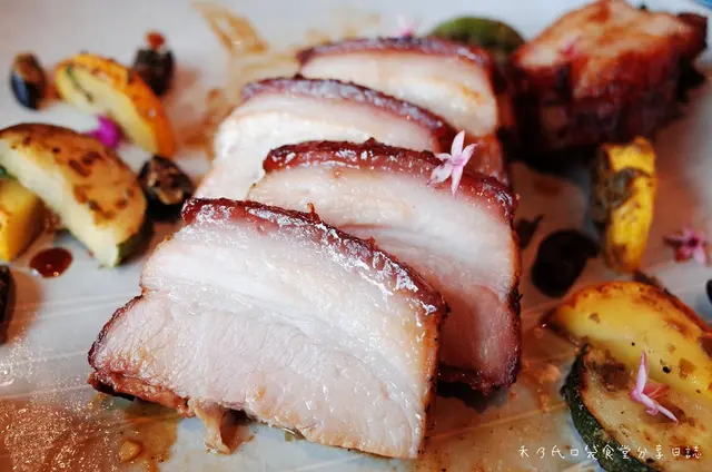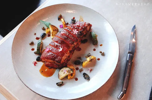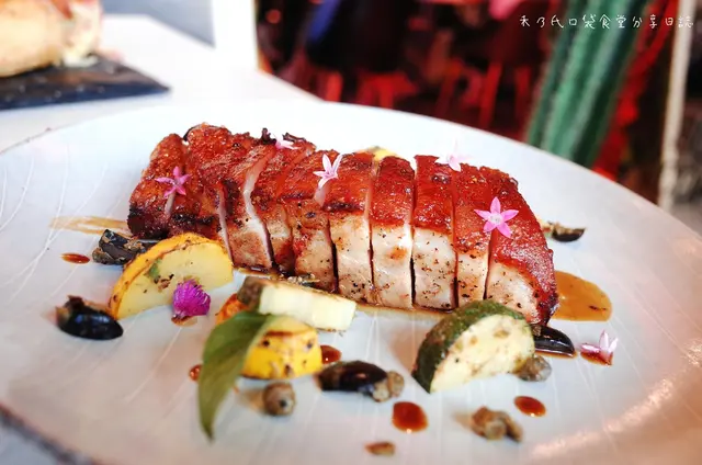 帶著優雅氣息的香草豬上桌,周圍環繞花朵與時蔬妝點,有種幸福的感覺,這道是以台灣黑豬腹肉,以黃綠檸檬、柳橙、肉桂、丁香、八角、胡椒、月桂葉及西班牙煙燻甜椒粉醃製2日入味,再以低溫烹調8小時,讓肉質充分吸附香草芬芳。