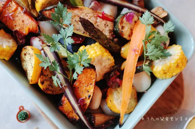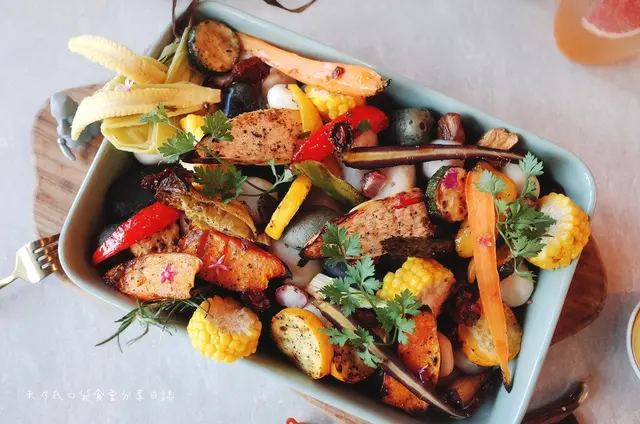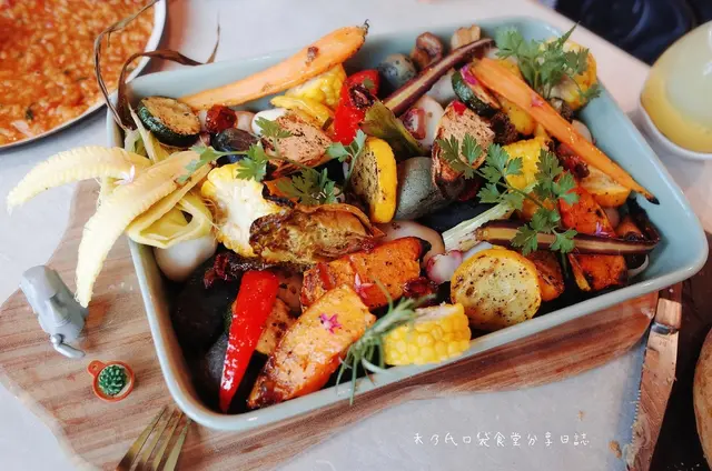 這道菜無論視覺或份量都很彭湃!!有種在歐美鄉村草原上野餐的自然氣息,想像穿著波希米亞風的米白洋裝,頭戴大圓草帽,在和煦陽光篩灑下~搭配著美酒享用這道如美麗景緻般的料理,選用了櫻桃蘿蔔、紅黃紫各色迷你蘿蔔、粗蘆筍、筊白筍、黃綠櫛瓜、玉米、羽衣甘藍等新鮮時蔬,以直火炭烤讓蔬菜的天然甜香充分釋放,多汁可口無負擔。