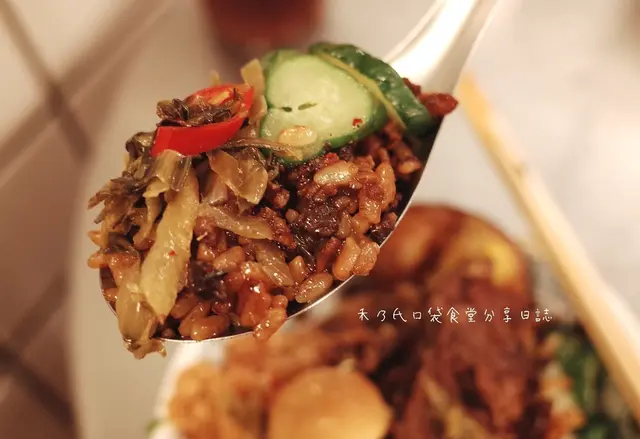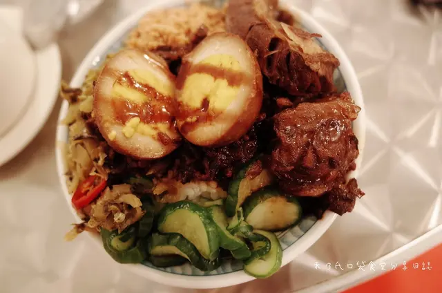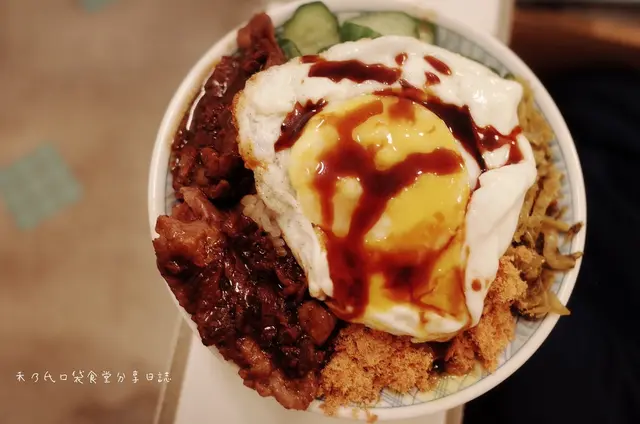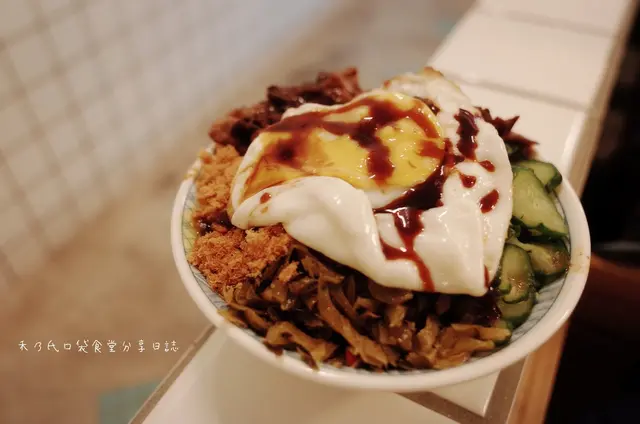 掀開半熟蛋,鋪在白飯上的滷肉則是選用半肥半瘦的豬五花,口感上較不膩,半熟蛋緩緩流出的蛋液攪拌著吃,搭配肉鬆及小黃瓜酸甜脆的清爽,香噴油脂與蛋鮮滑嫩在舌尖上交織,一口接一口停不下來。