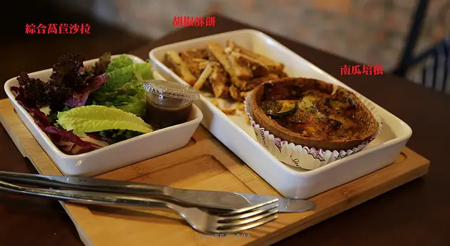 夢想村鹹派套餐包含了綜合萵苣沙拉與胡椒酥餅,飲料則是可以任選一杯。