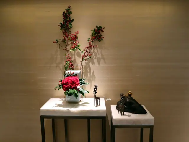 特別聘請知名設計師團隊在12樓小吃區與各包廂中,用中國風與現代感混搭的創意美學。主梁柱選用藍金沙雲石,獨具巧思韻味。天花板上以黃白相間的水晶燈,是來自捷克品牌「Lasvit」,吊燈一盞盞皆由手工打造,捷克原廠並派人到現場安裝。透過水晶折射出的晶瑩穿透,讓空間散發華麗璀璨的優雅氣息。地毯紋彩如山水潑墨,視覺效果強烈,為空間創造流動感。