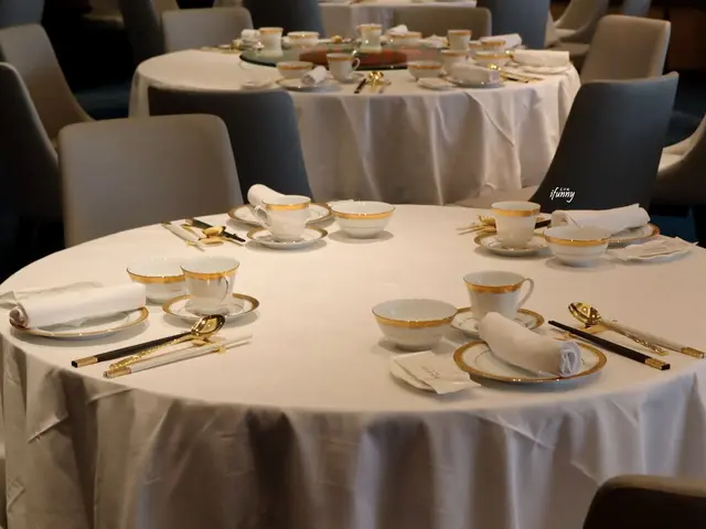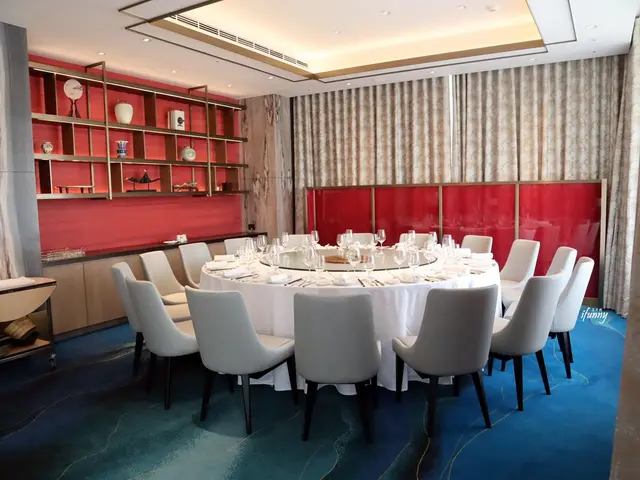 摘星樓以星雲狀燈飾打造滿天星斗,搭配國賓川菜廳標誌性烈紅地毯,更顯大氣磅礡。特殊活動滑軌隔間,可將場地區分為4間私人包廂,敞開則可容納約13桌中西式婚宴、60至70人會議或產品發表會等小型活動,這天是某扶輪社的聚會。