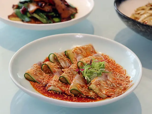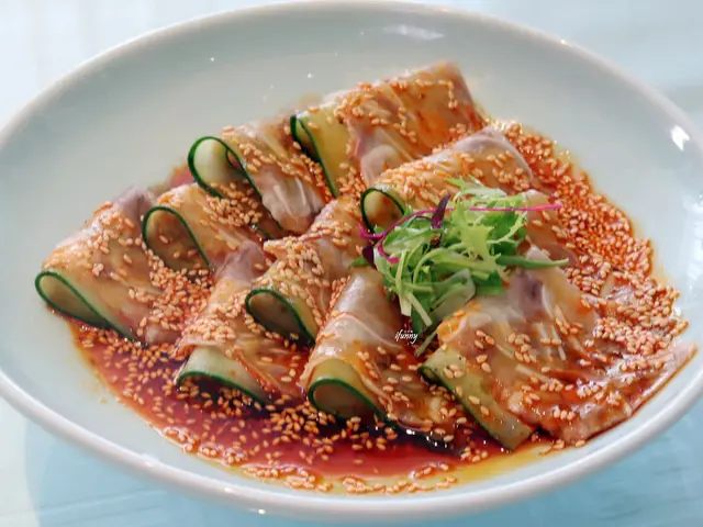 經過兩小時烹煮的豬耳與豬凍膠質交疊壓製成型,再片成薄薄且微微透光的耳片,及小黃瓜交疊擺放盤中,鋪上主廚特製的紅油醬料。