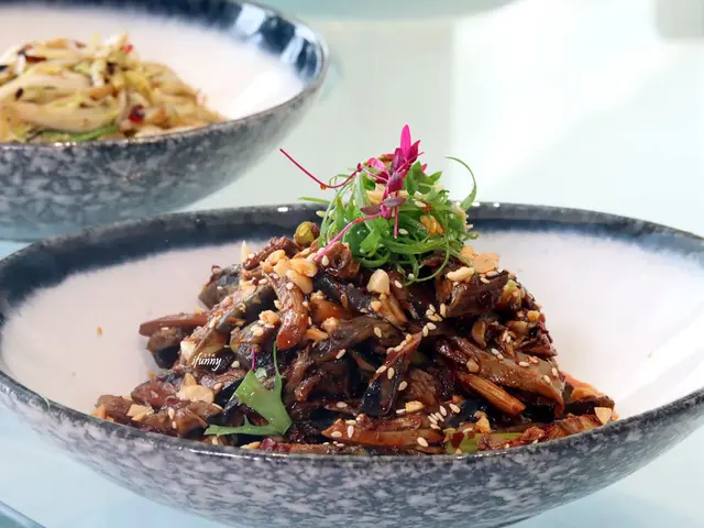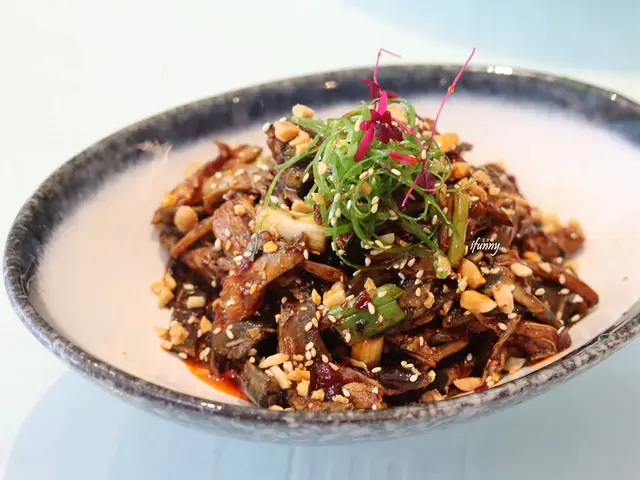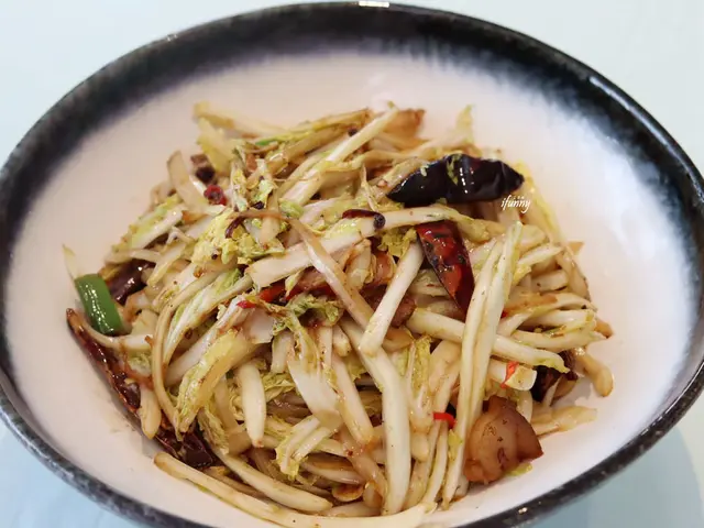 將烏骨雞煮熟浸泡後切成粗絲,加入柳松菇,與炒香的宮保乾辣椒碎與花椒粉、辣油及獨門高湯等均勻混和。香氣濃郁的椒麻感當作冷盤享用,十分清爽開胃。