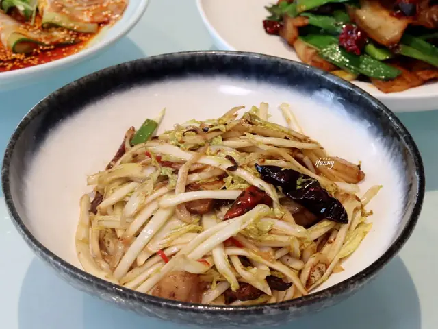 將翠綠的娃娃菜切絲,與豐富香料、麻辣鮮露、蒸魚醬油等及五花肉片一起拌炒。娃娃菜入口的爽脆口感,咀嚼後呈現溫和香辣的鮮食感。