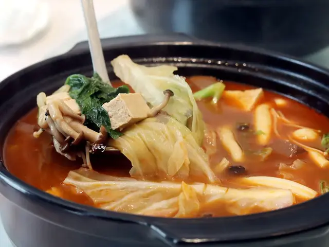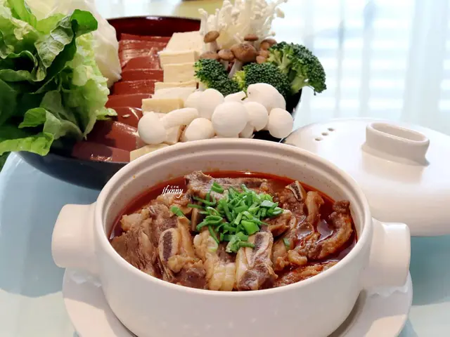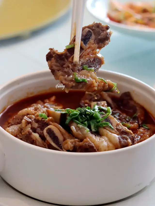 帶筋的牛仔骨,與馬鈴薯塊一起放進鮮麻香辣的火鍋湯底中。用宮保乾辣椒、花椒、辛香料爆香後加入牛肉湯一起熬煮。牛排與火鍋的搭配十分特別,牛排肉質香料入味,吃來十分嫩口,帶筋部位吃來很有嚼勁,馬鈴薯塊吸附了湯汁鬆綿麻香,吃來相當地過癮!
