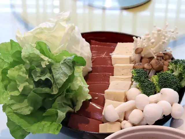 隨火鍋一起的菜盤,內含凍豆腐、菇類、鴨血、青菜,之後會收至廚房煮成火鍋。