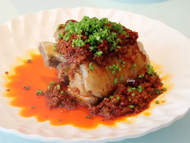 這整隻肘子上桌時不僅香氣逼人,且相當有氣勢啊!主廚將豬肘加入炒香的辛香料後以小火燜煮四小時。其上的醬料部分是取泡椒醬為基底,加入薑末、花椒粉、刀口椒粉及老陳醋等炒香,最後淋在豬肘上。豬肘肥軟適中,吃來豐富的膠質黏在唇上,而吃來仍保留著Q勁,搭配醬汁更添風味。