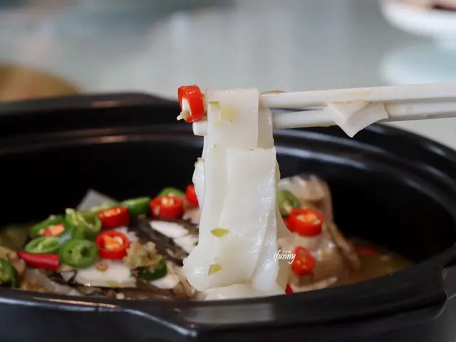 國賓川菜廳主廚特別稍加改良,將野山椒與泡白椒炒香,並調味後製成甘香鮮辣的雙椒醬。碩大的大鰱魚頭,經過蒸製後的鮮香肉質完整被保存,雙椒的味道又恰到好處地滲入到魚肉當中,搭配的板條吸附酸香醬汁,入口細嫩晶瑩,帶著一股個性鮮明的酸辣鮮甜。
