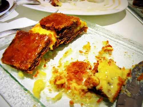 這千層派外層裹了焦糖,應該是怕派皮沾上卡士達醬反潮,