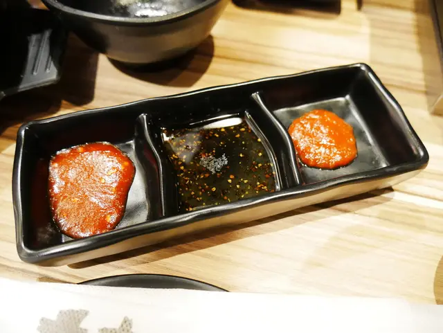 醬料由左至右分別是辣醬、椒鹽香油與韓式豆瓣醬