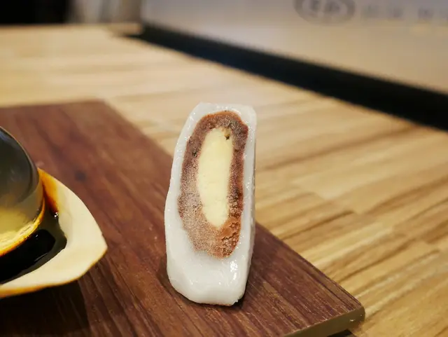 這個小點的最外層是麻糬,再來才是由紅豆泥包覆綠豆泥的內餡