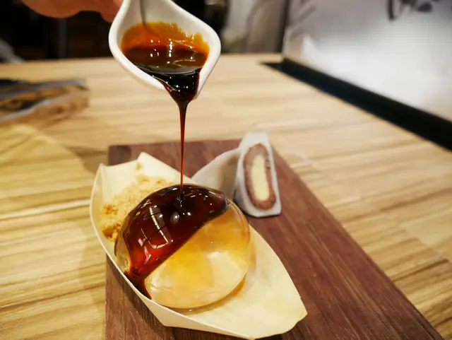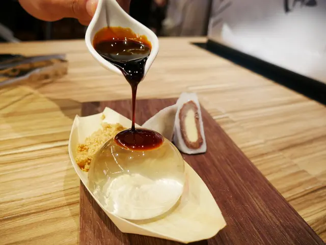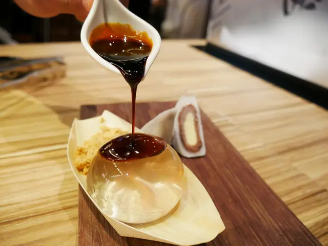 晶瑩剔透的水信玄餅配上黑得發亮的黑糖漿,兩者配合在一起呈現優美而和諧的狀態