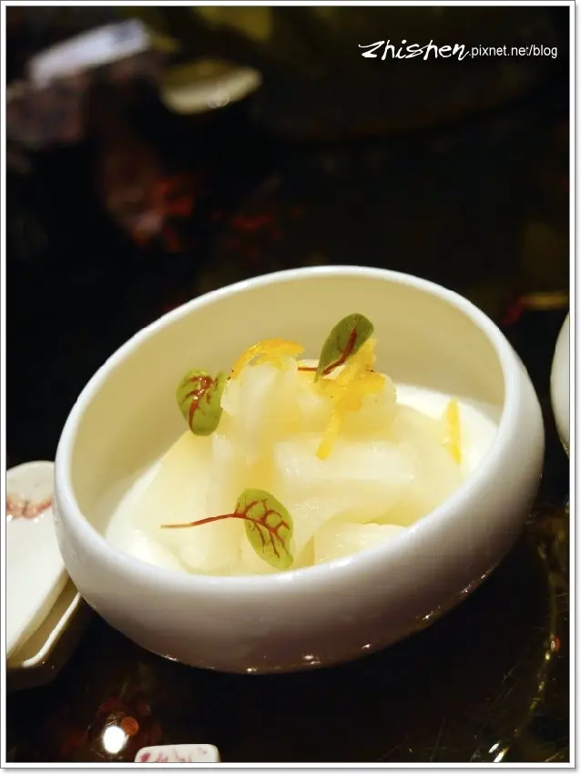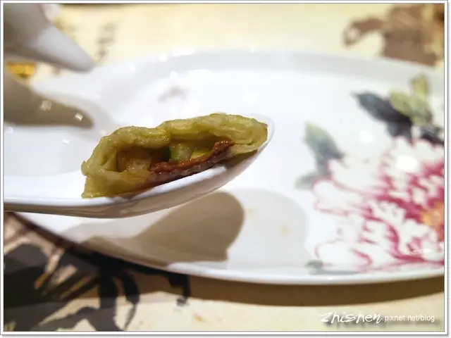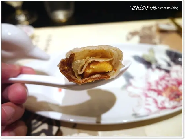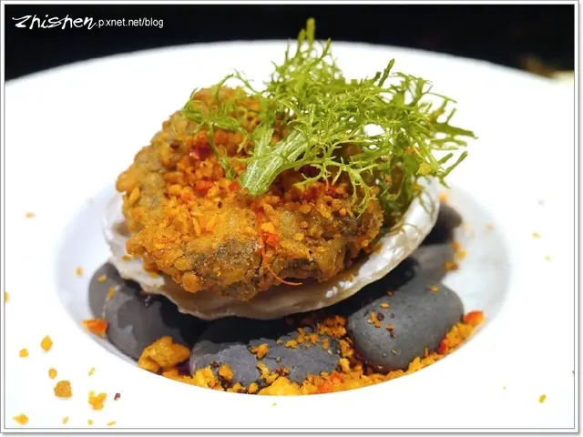 鮑魚上薄油炸帶上酥脆薄衣,再以類似避風塘的方式來呈現,相較通俗燉煮入味的呈現魯是覺得其實還不錯,可以吃到更原始的口感,香氣又很好,不過或許為要平衡鮑魚的厚度關係,外頭的避風塘炒料味道鹹度有點太高,是大家一致認為口味太重的一品,倒是有點小小可惜。