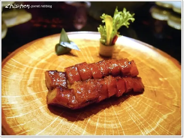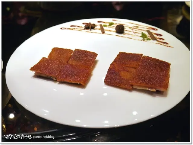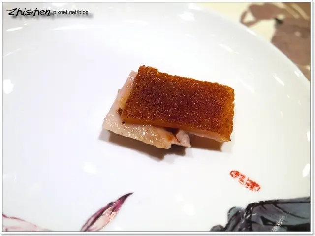 燒乳豬一口咬下的酥脆和炸子雞的雞皮一樣有著讓人瞬間亮眼的魔力,靠著皮下油脂及嫩肉的柔軟及在嘴裏綿延的香氣,這一人一片反倒是吊足人胃口~"~