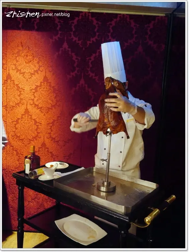 火焰片皮鴨秀,片鴨之前,由客人現場選定一種酒,分別是高梁及君度橙酒,師傅把選定的酒淋在烤鴨上,點火瞬間燃燒,噱頭十足,酒精在點燃揮發後也讓烤鴨帶上香氣,未嚐先聞香。